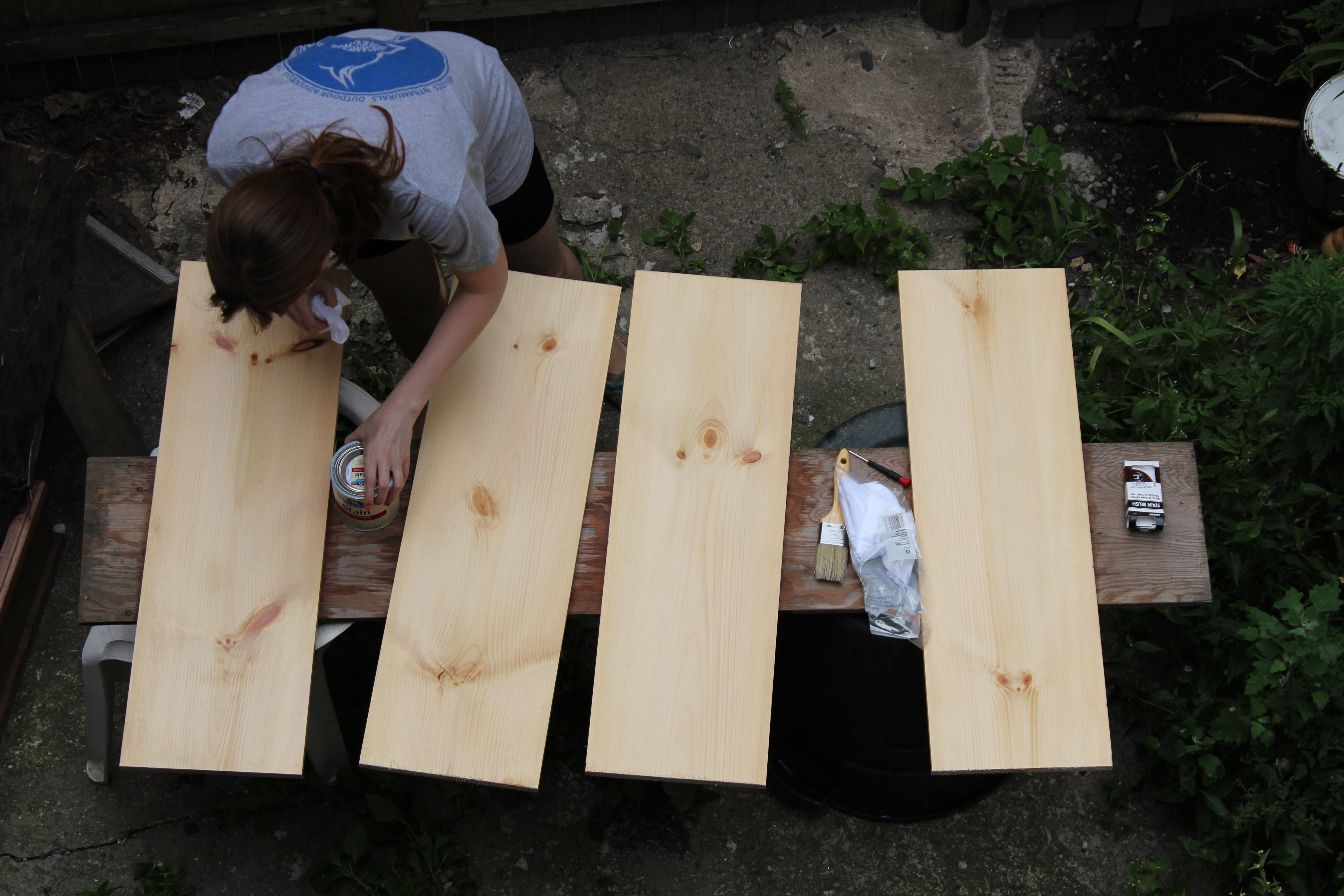 STEP 1: Preparing the shelves. IMG_0553I started by staining the shelves in our backyard. Yes, we have a (shared) backyard at our new place! This youtube video provided a useful tutorial to refresh my memory on staining. If you’re using a soft wood, like pine, the first step is to use a pre-stain conditioner, which helps the stain absorb more evenly. You can tell if your wood is soft by grazing your finger nail against the plank; if it leaves a mark, its soft. An advantage of soft wood is that it takes in stain very easily – I only had to do one coat on each side. I like to wear gloves and have paint-thinner on hand when staining because I learned  (the hard way) that wood stain is oil-based and won’t come off skin during a previous project. Its also useful to a sponge brush, which spreads the stain very evenly. I brushed on the stain with the grain, covering the entire length of the board with one stroke. After about 20 minutes, I wiped off the excess stain and let it dry. After about 2 hours, the wood was no longer tacky, but I waited 24 hours to flip it and stain the other side. The final step was to apply 3 coats of polyurethane to the boards. The entire process took about a week, owing to rainy days and a long work week.