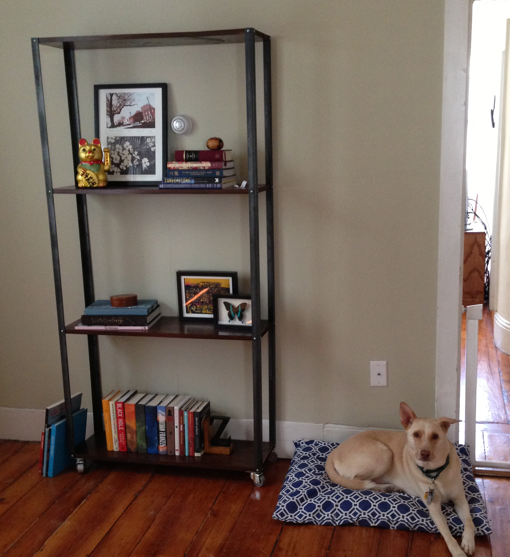 STEP 5: Decorate.IMG_1494 So, the purpose of this shelf project was to create a home for 4 boxes of books that had been in the back of a closet while we lived in our smaller apartment. Unfortunately, I was so happy with our end result that l  didn’t want to put any old books on the shelf. We selected a collection of “pretty” books and other decor items to arrange.  The shelf was the first piece of furniture for our new dining room. The top picture in the post depicts our subsequently acquired table (also a semi-DIY), rug, and sideboard.