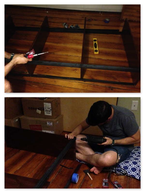 STEP 3: Putting it all together.jz drillsWe started  by standing up the top and bottom shelves and balancing two of the steel angles on either side. I held the bottom shelf in place while Jason pre-drilled holes into the top shelf and then screwed the plank in place. This process was repeated for the bottom shelf. Then we flipped the whole operation over and balanced the remaining two steel angles on top of the top and bottom shelves. At this point we abandoned pre-drilling holes because our wood was so soft that it was really no problem to screw directly into the wood to secure the steel to the planks. Finally, we screwed in the middle two shelves. This step took approximately 45 minutes.