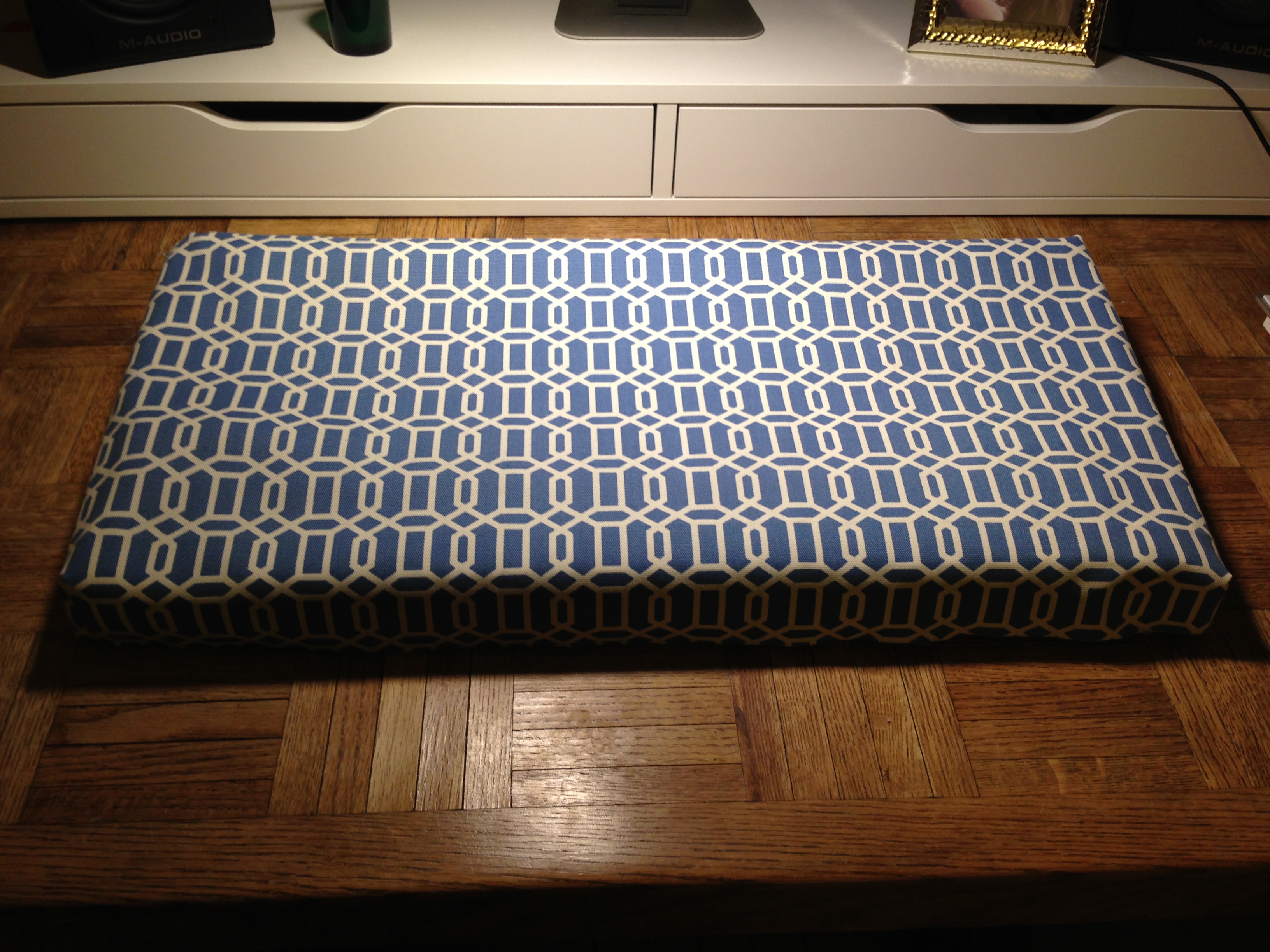 Our apartment’s bedroom also doubles as my husband’s recording studio. He recently purchased a new synthesizer and within minutes of setting it up, Cher (our cat) decided it was a desirable place to nap. We wanted to protect our investment, but because the “studio” takes up about 50% of our shared living space, we wanted to be mindful of design. I decided to make a custom cover for the synthesizer using leftover fabric from our dining chair reupholstering project. Instructions after the jump…